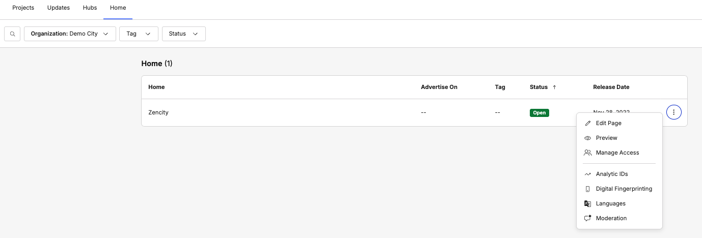 Navigate to content pages list here in the Communicate section. Navigate to the Home tab and select the Home page you wish to work with. Setting the language for a Home page will set it for all Hub, Project and Update pages within your page structure.