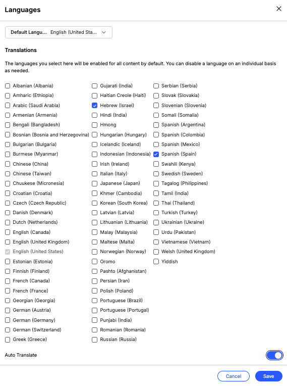 - On the Languages pop-up, select your default language and the translated languages that should be available to residents to choose from. They will see a language drop down on the top right of your Content Pages. Be sure to click Save when you're done.