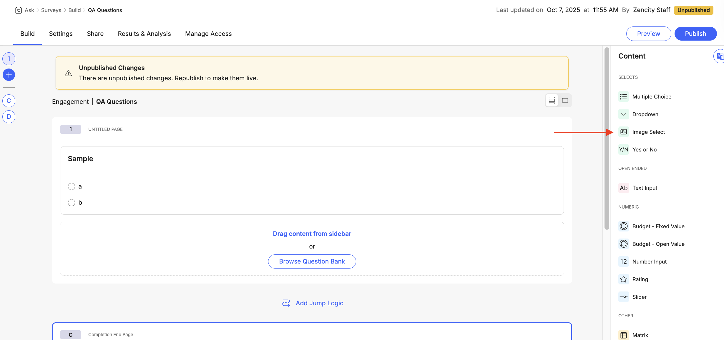 Add the Image Select Question From the Content sidebar on the right, locate "Image Select" under the "SELECTS" section. Drag the Image Select element and drop it into your questionnaire at the desired position.