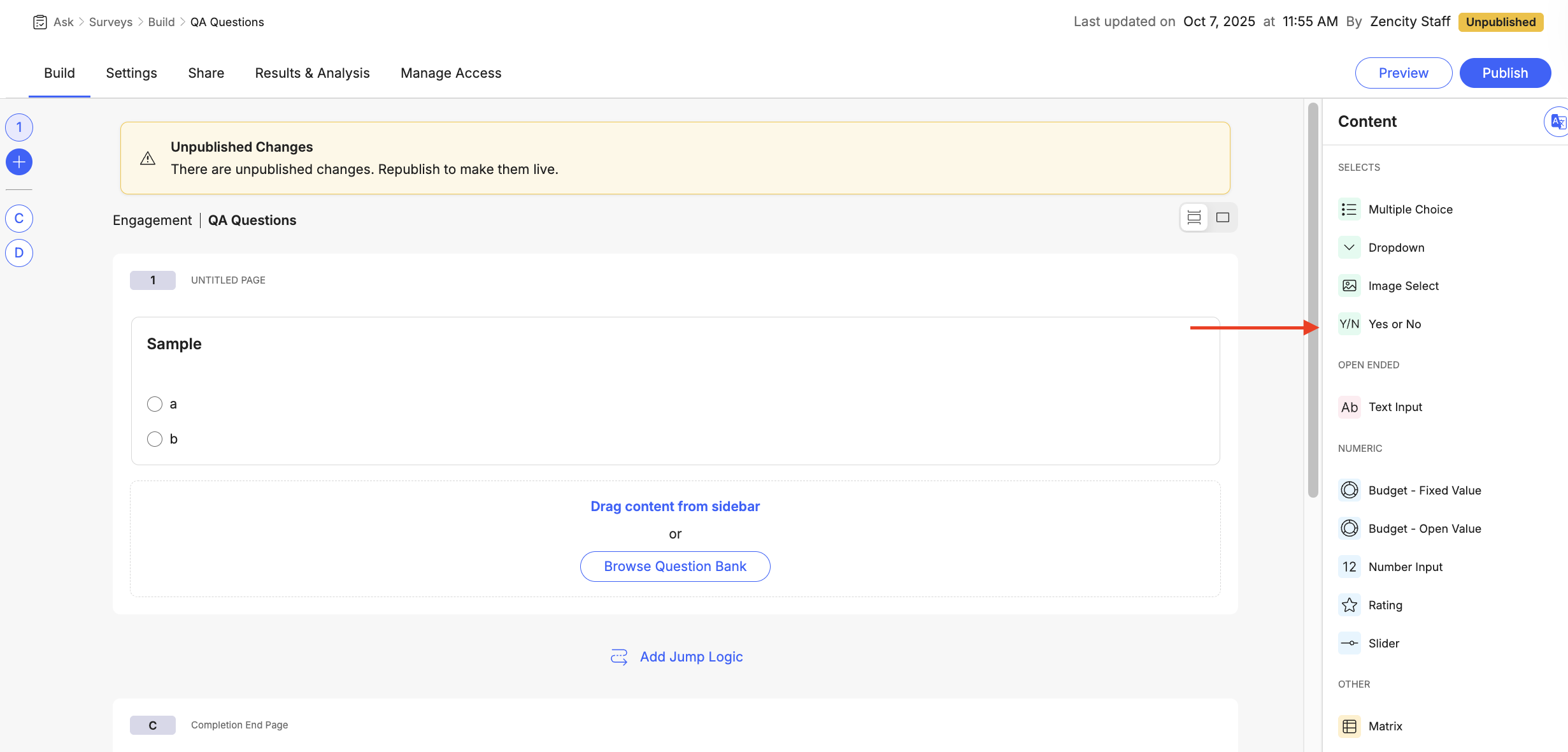 - Drag "Yes or No" from the Content sidebar under "SELECTS"
