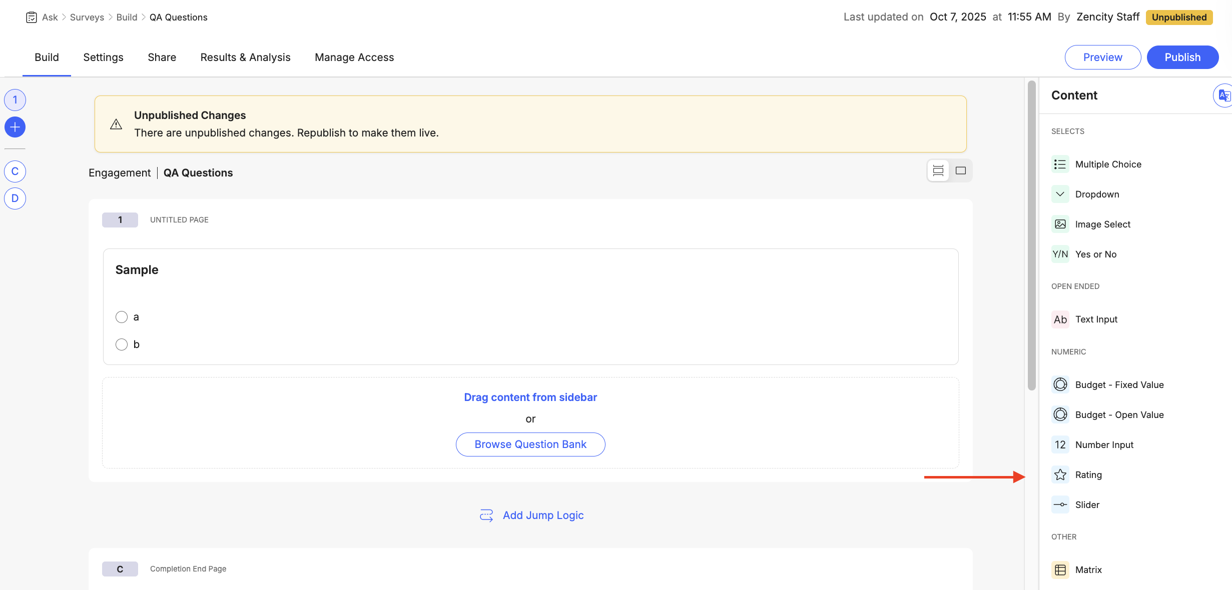 Add the Rating Question From the Content sidebar on the right, locate "Rating" under the "NUMERIC" section. Drag the Rating element and drop it into your questionnaire at the desired position.