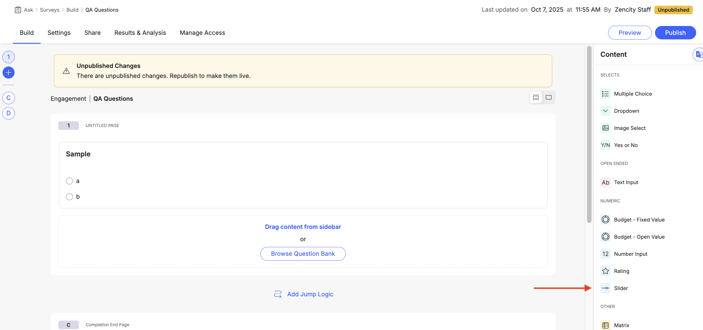 Add the Slider Question From the Content sidebar on the right, locate "Slider" under the "NUMERIC" section. Drag the Slider element and drop it into your questionnaire at the desired position.