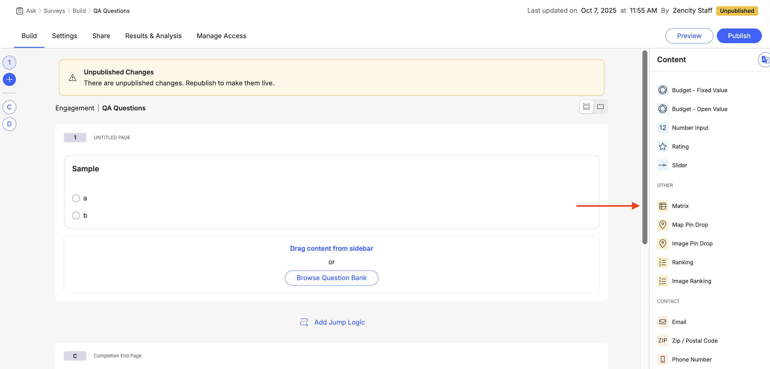 Add the Matrix Question From the Content sidebar on the right, locate "Matrix" under the "OTHER" section. Drag the Matrix element and drop it into your questionnaire at the desired position.