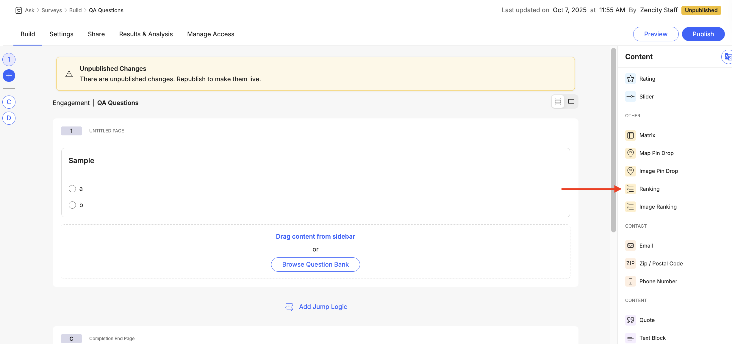 Add the Ranking Question From the Content sidebar on the right, locate "Ranking" under the "OTHER" section. Drag the Ranking element and drop it into your questionnaire at the desired position.