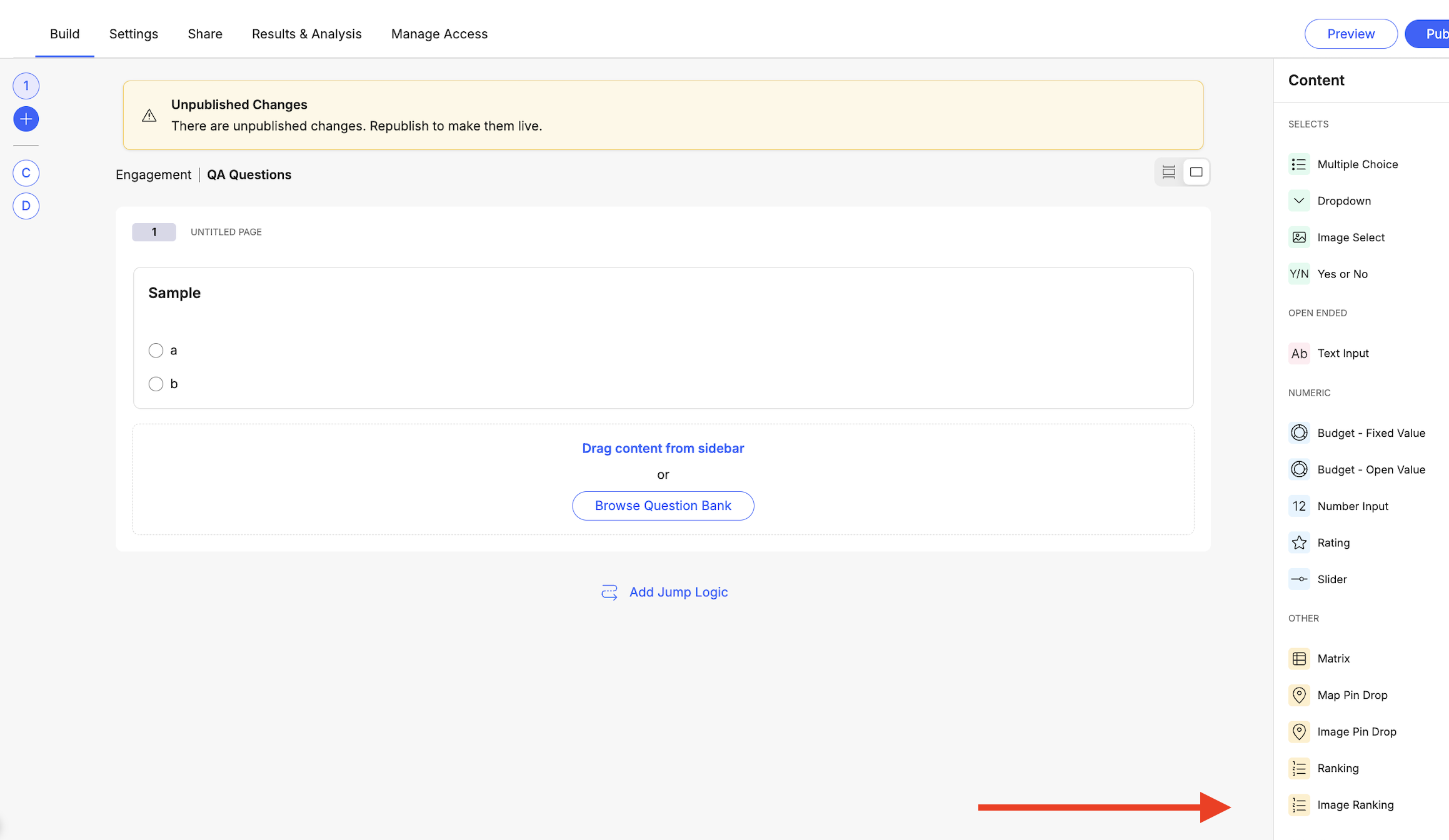 Add the Image Ranking Question From the Content sidebar on the right, locate "Image Ranking" under the "OTHER" section. Drag the Image Ranking element and drop it into your questionnaire at the desired position.
