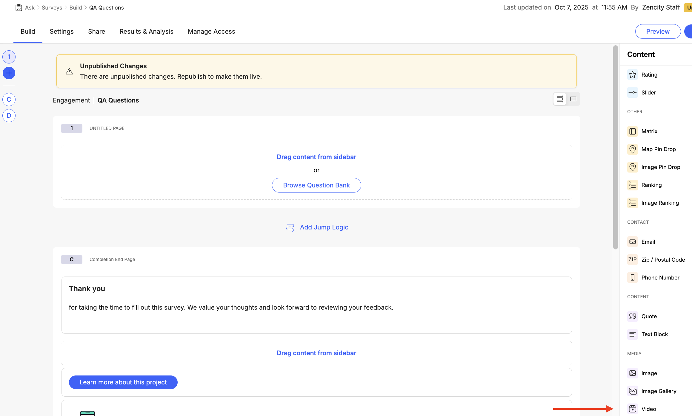 Add the Video Element From the Content sidebar on the right, locate "Video" under the "MEDIA" section. Drag the Video element and drop it into your questionnaire at the desired position.