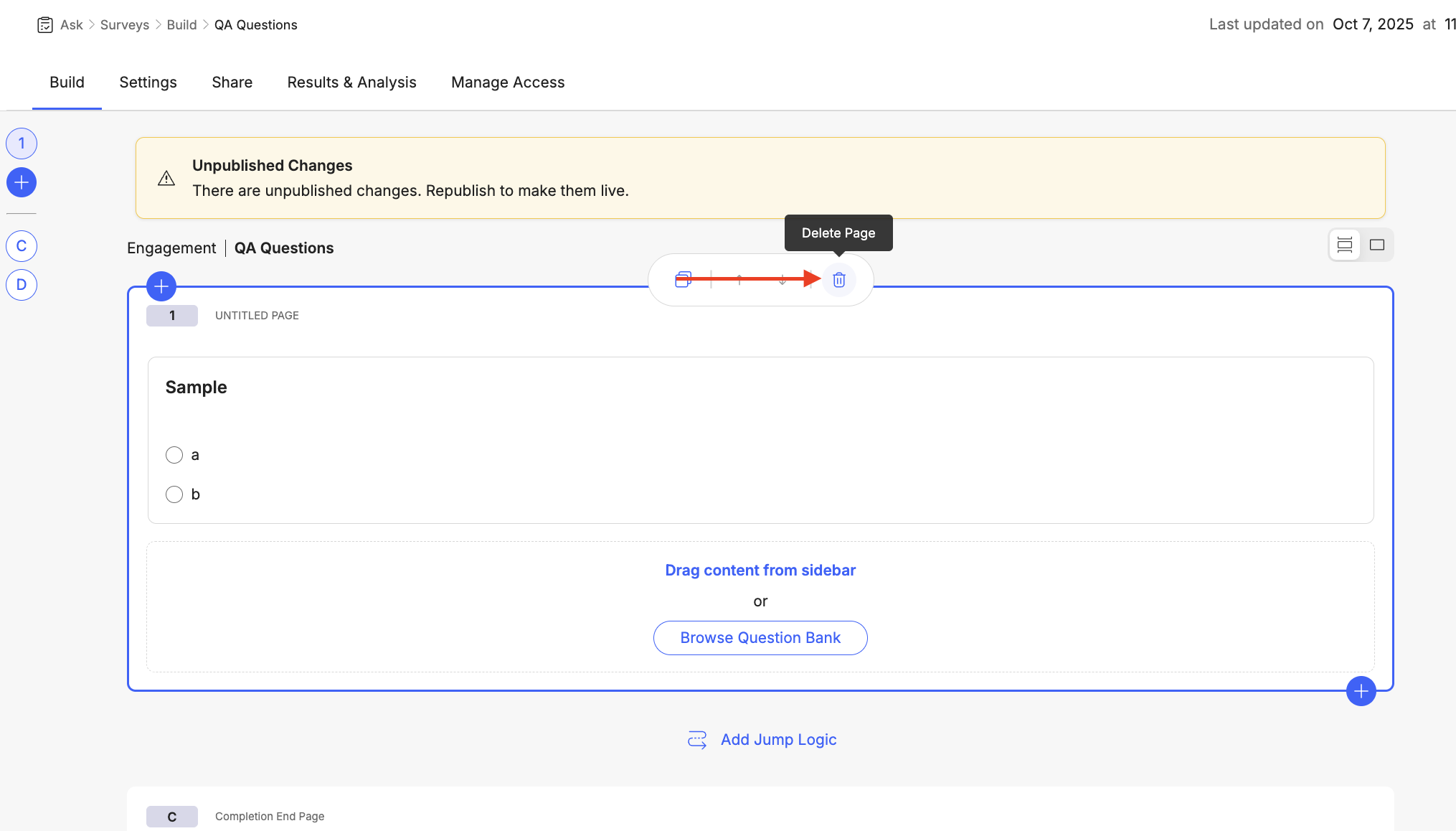 With your desired page selected, locate and click "Delete Page" in the page toolbar. This will prompt you to confirm the deletion before permanently removing the entire page and all its contents from your questionnaire.