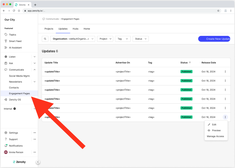 - Navigate to your left toolbar > Click 'Communicate' and 'Engagement Pages'.