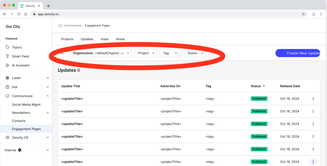 Filtering Listing Screens - Project Pages, Project Updates, Hub Pages, and Home Pages
