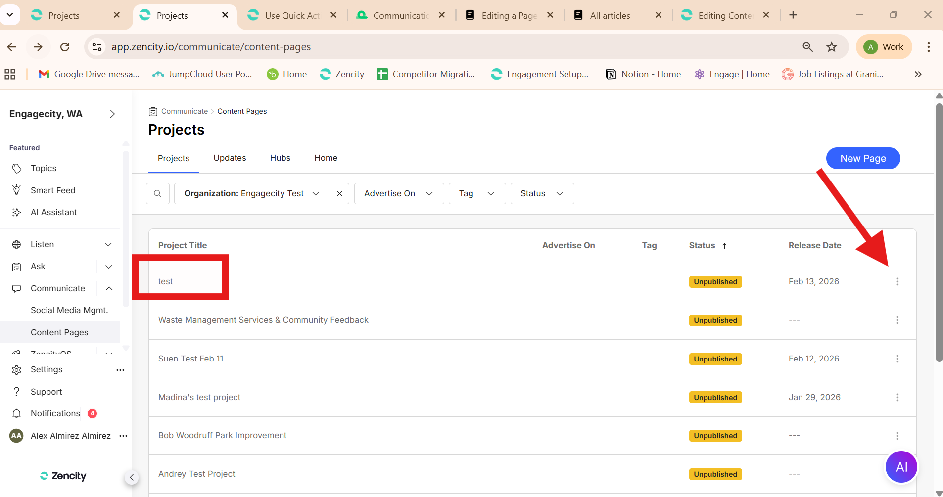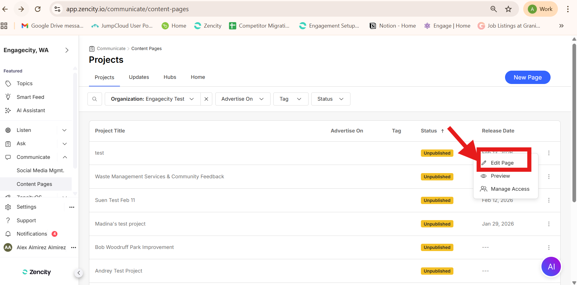 3. Under 'Projects' tab, select the name of the Project you want to edit or click the 3 dots on the right side of the project and click 'Edit Page'