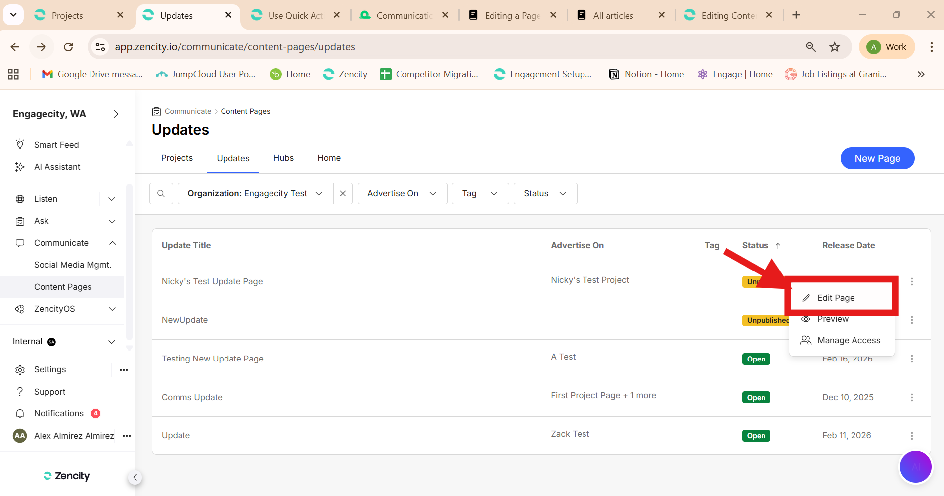 3. Under 'Updates' tab, select the name of the Project you want to edit or click the 3 dots on the right side of the project and click 'Edit Page'
