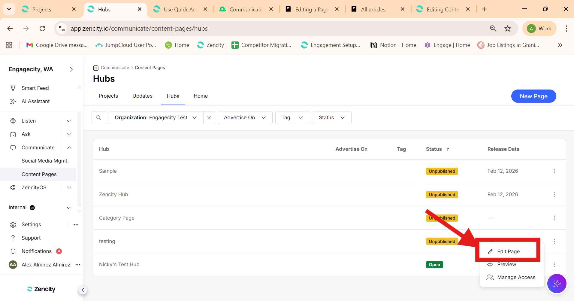 3. Under 'Hubs' tab, select the name of the Project you want to edit or click the 3 dots on the right side of the project and click 'Edit Page'