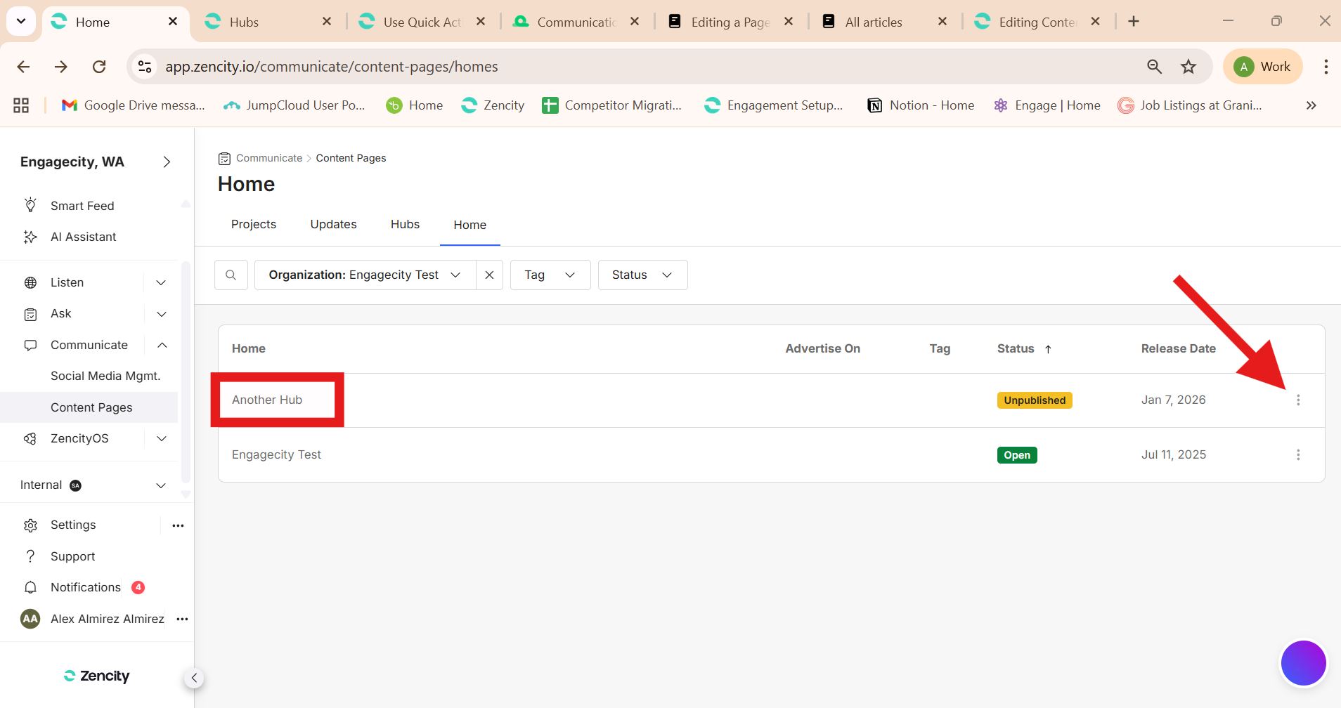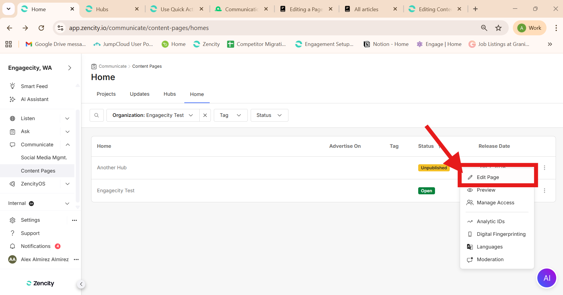 Editing a Hub Page ( Action Menu)
