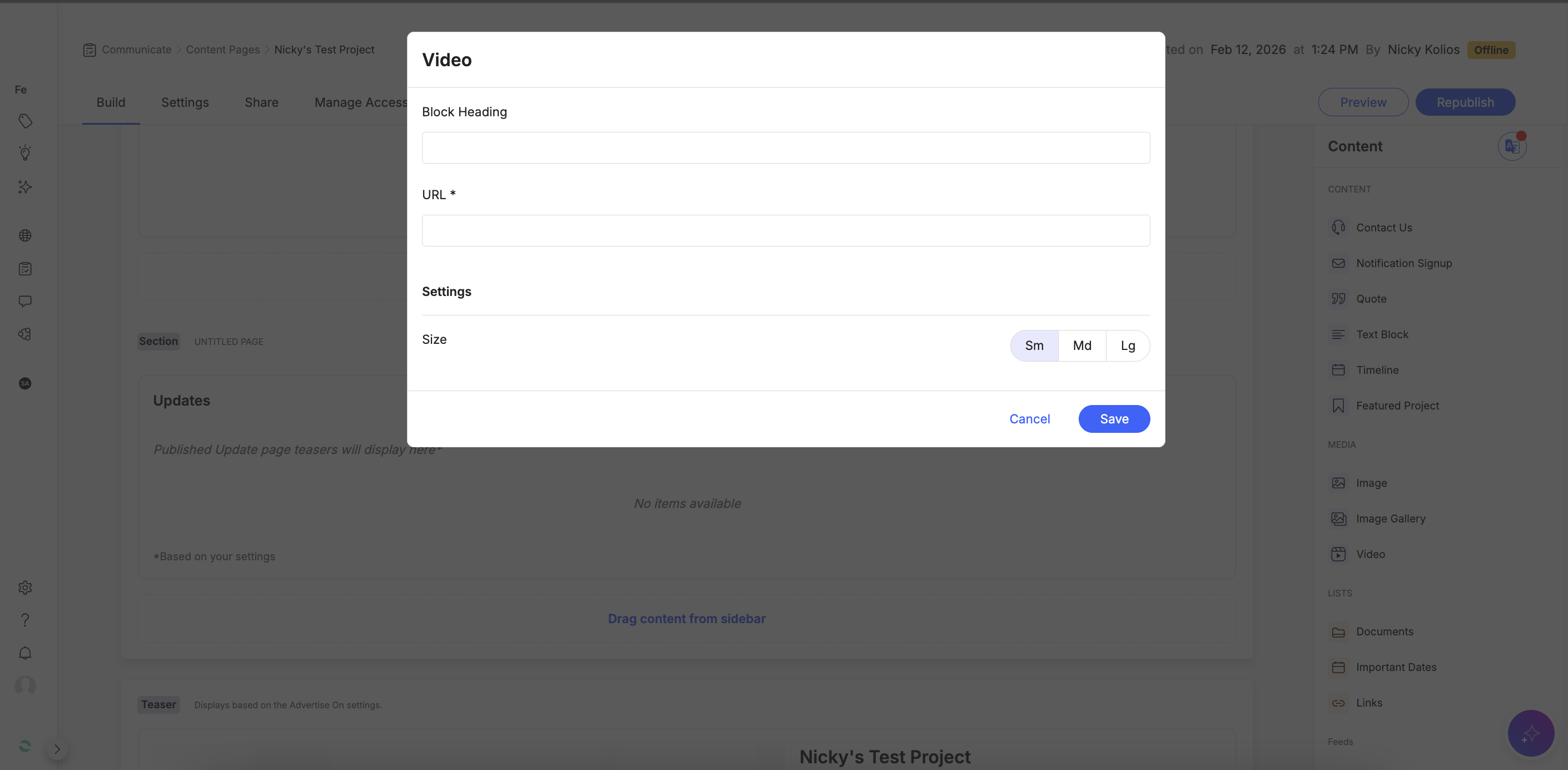 - When you release the item to its desired spot the relevant modal with open so you can input the contents of the element you've chosen e.g a text box to type in, an option to upload images, fields to fill in with the details of a timeline, etc.