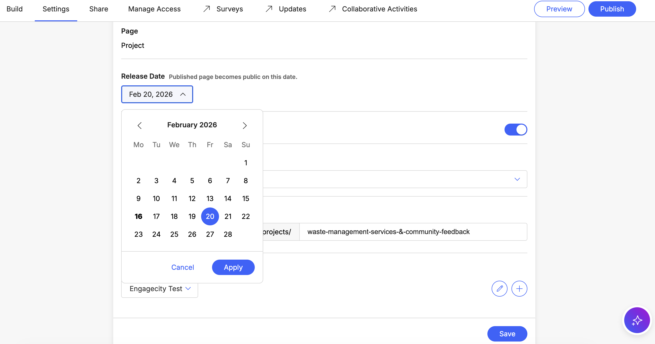 Launching a page on a specific date allows you to control when content is published and align it with any marketing campaigns, using the Zencity Newsletter tool or through other distribution methods.