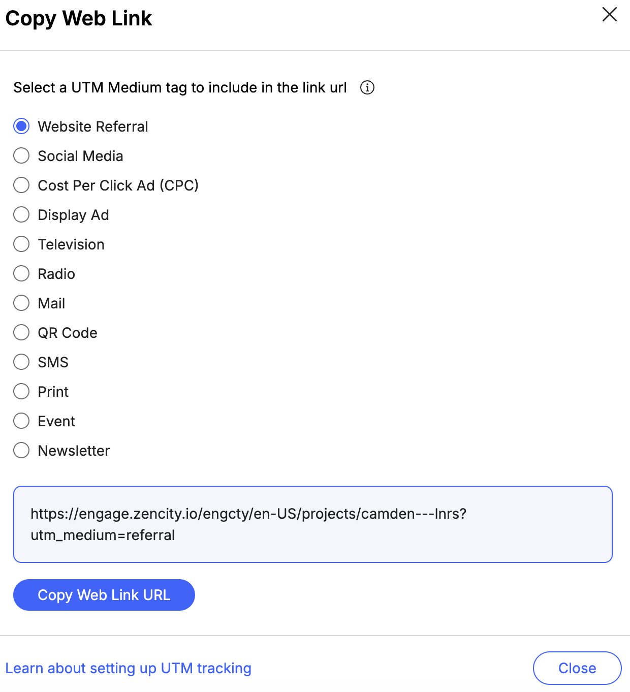 When sharing a web link, we'll prompt you to select which channel you plan to distribute through. This will allow you to later track the performance of each channel. A unique URL containing a unique UTM code is generated. For more information on UTM codes, check here: https://help.zencity.io/hc/en-us/articles/31649756088465-Setting-up-Custom-UTM-codes-for-your-Engagement