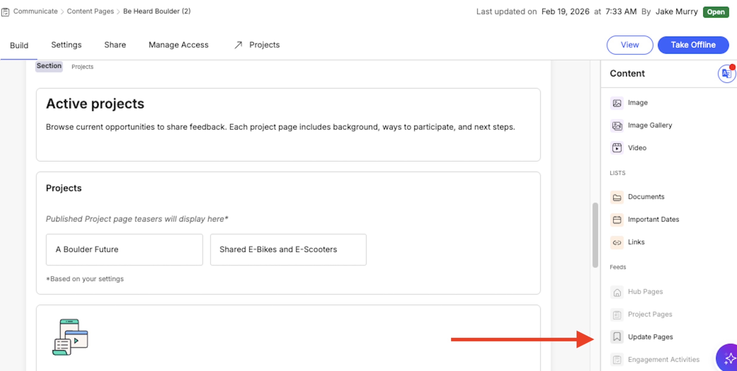 You can add a Project Updates Feed to display published updates from a specific project directly on your Content Page. This is useful for sharing progress, new information, milestones, and ongoing transparency with residents.