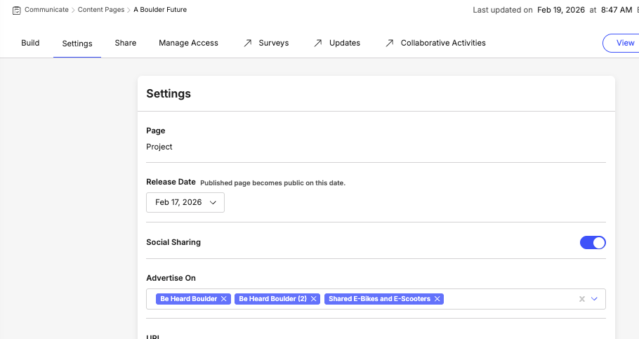 You can control whether social sharing options are displayed on a page. When enabled, visitors can share the page externally. When disabled, social sharing icons will not appear.