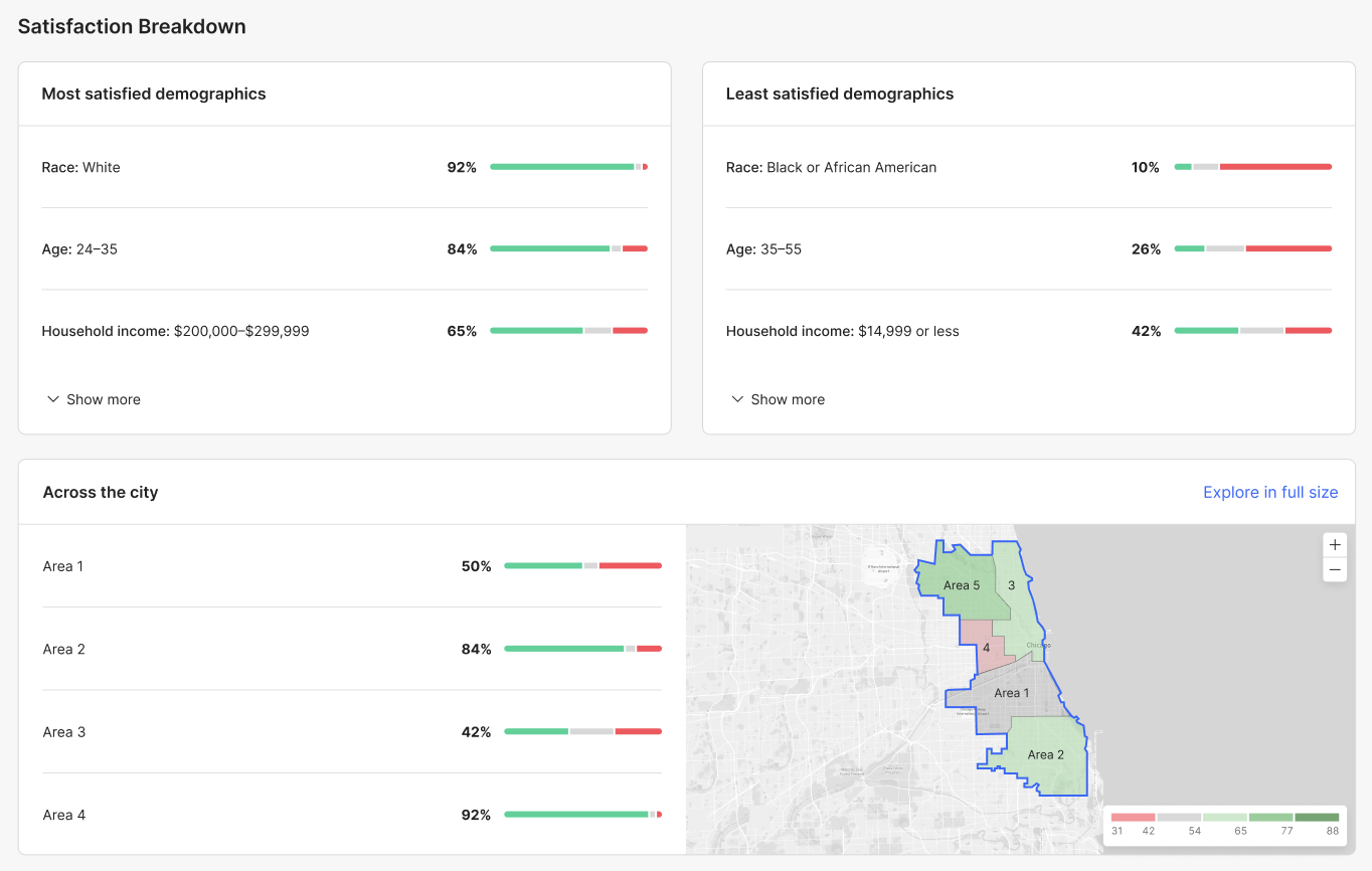 • Location: Areas are according to the breakdowns you determine during the survey setup process. To interact with the map, click on “Explore in full size.”