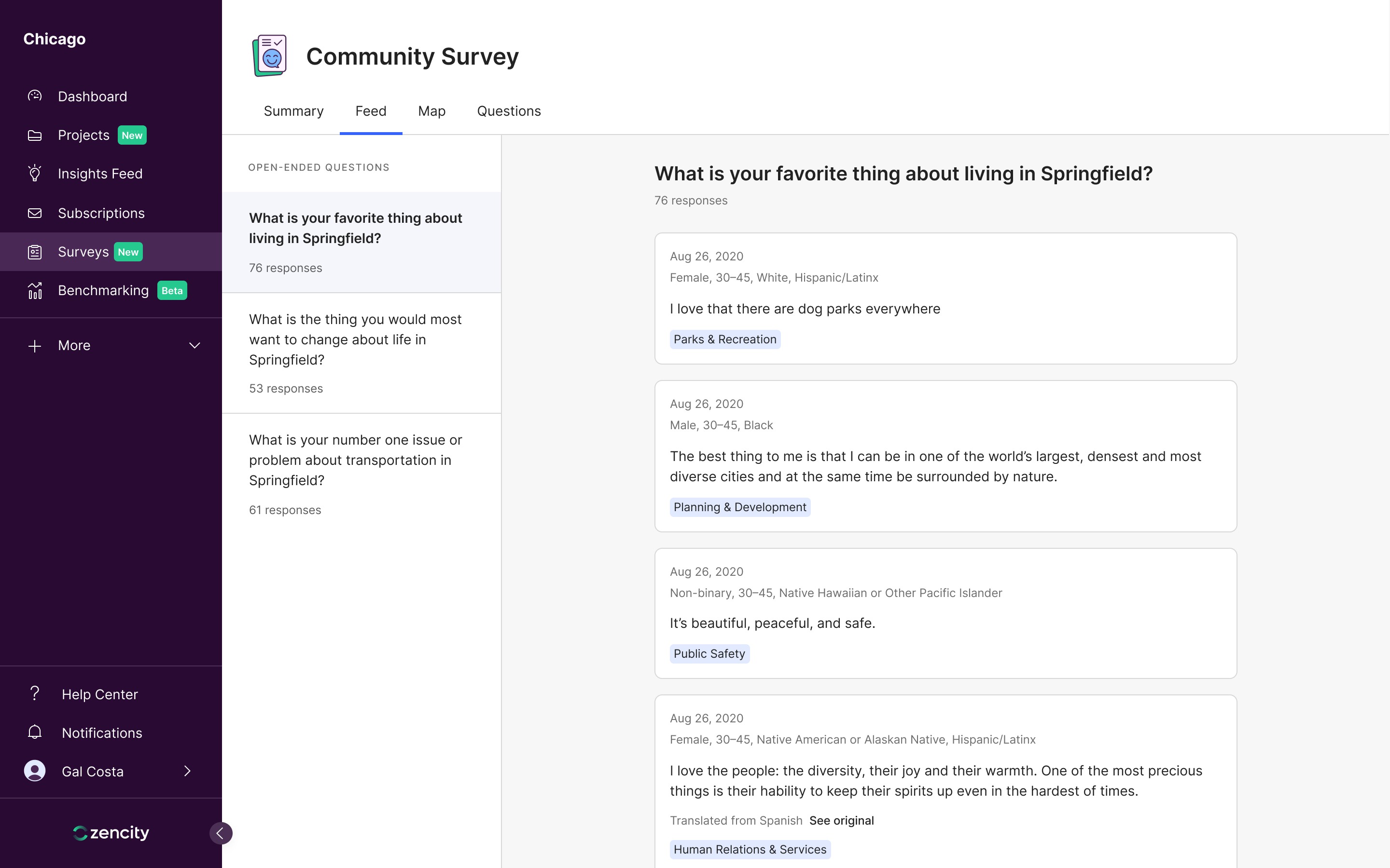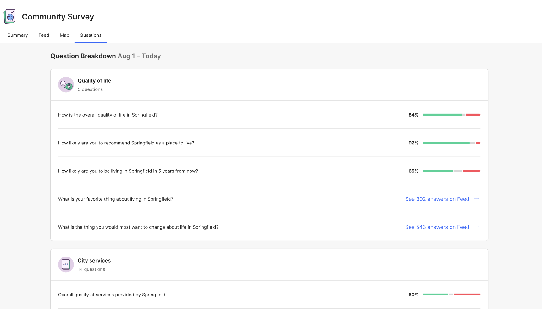 Your feed displays resident free-text responses to open-ended survey questions (e.g. “What is your favorite thing about living in Springfield?”). Unlike the summary, which is updated once a survey cycle, the feed displays responses as they are submitted, so you always have a running stream of resident feedback to check and reference.