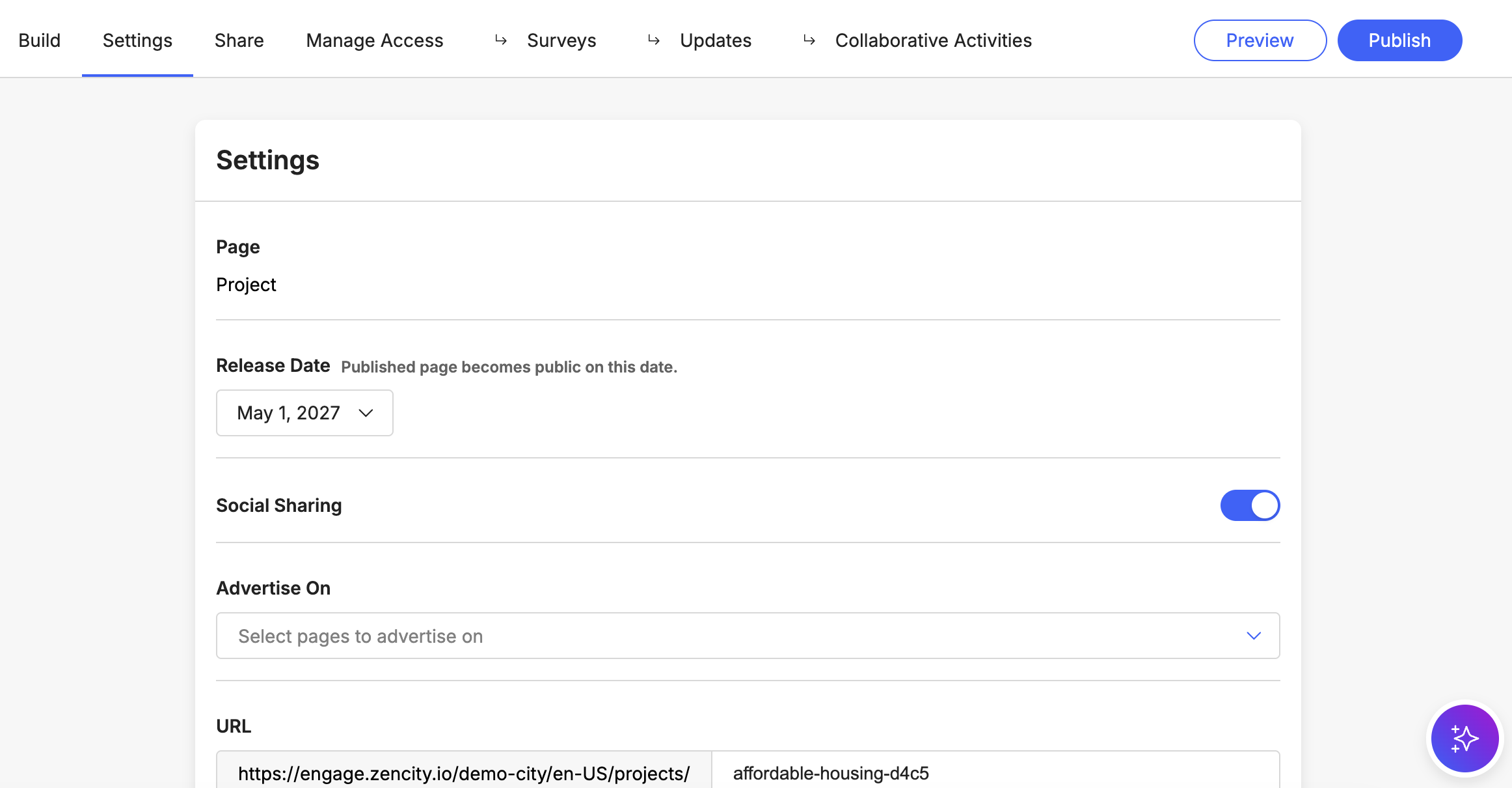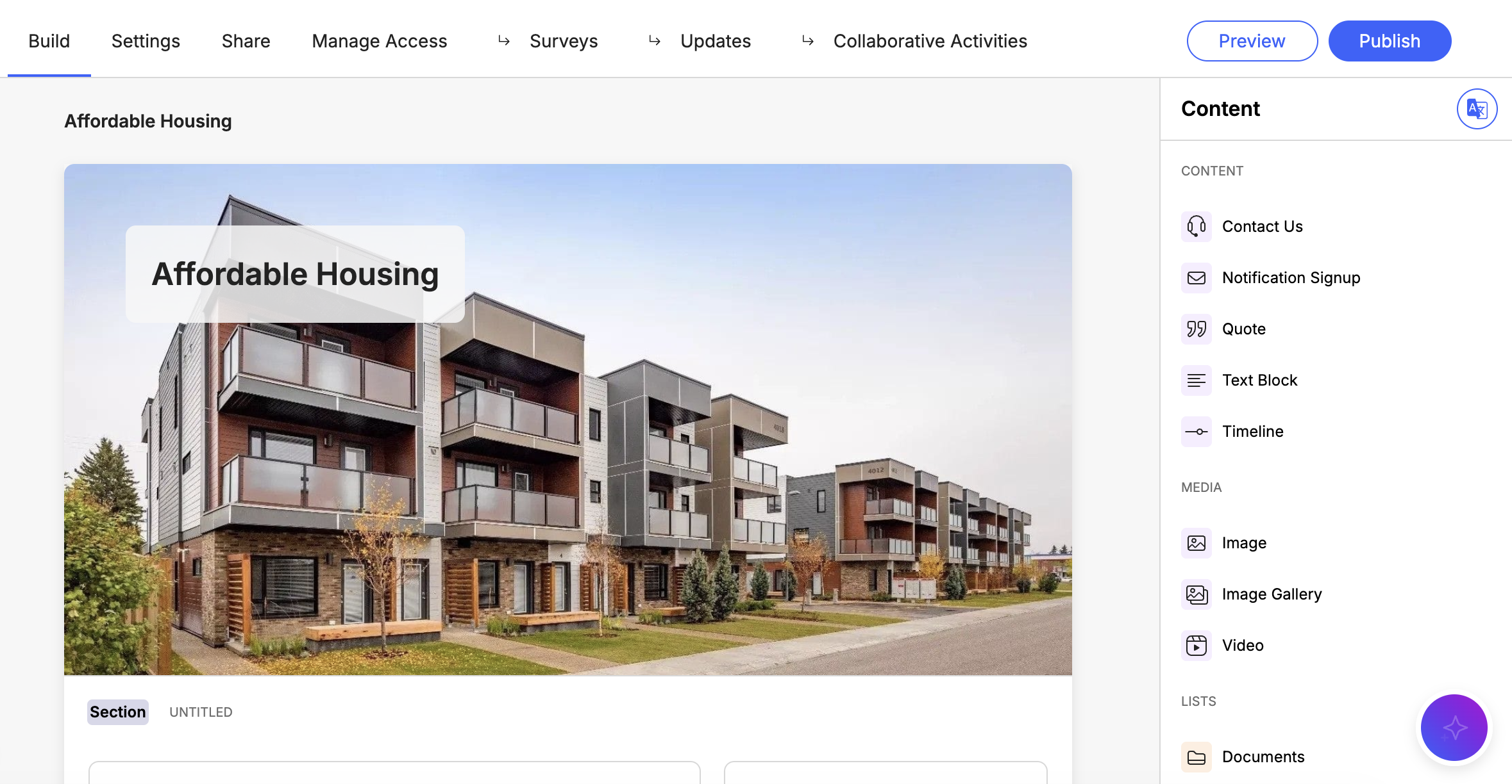 2. This will bring you to the page builder. From here, you can build, edit, manage access and publish your page.