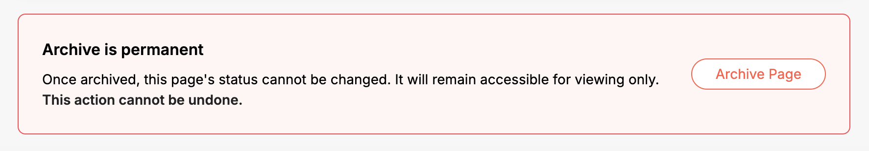 4. To archive your page once it has finished, scroll to the bottom of the Settings tab and click on the Archive option. This will unpublish the page and make it no longer editable or available for republish. This action can not be undone, so is not recommended unless you know you will never need this page again. You cannot archive a Homepage.