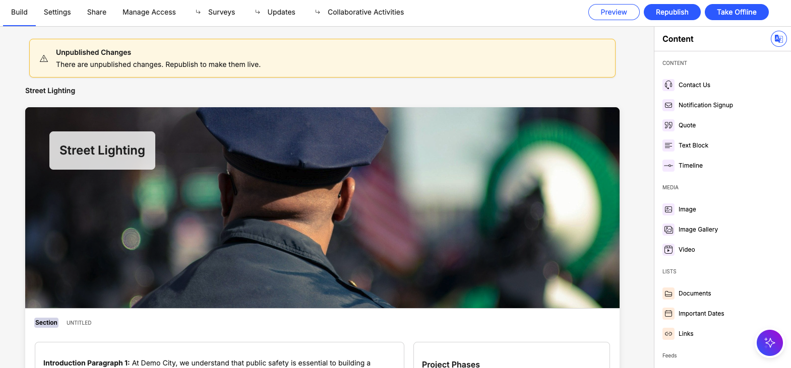 2. To make changes to your page once it has been published, make your edits on the Build tab and click Republish in the top right of your screen.  You will notice the 'Unpublished Changes' notification as in the screenshot below. This will persist until you Republish.