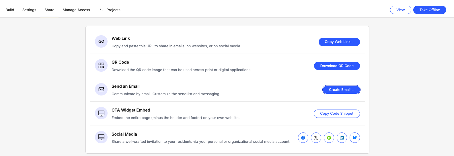 Once a Content Page (Home, Hub, Project or Update) has been published, it can be shared via all distribution channels.